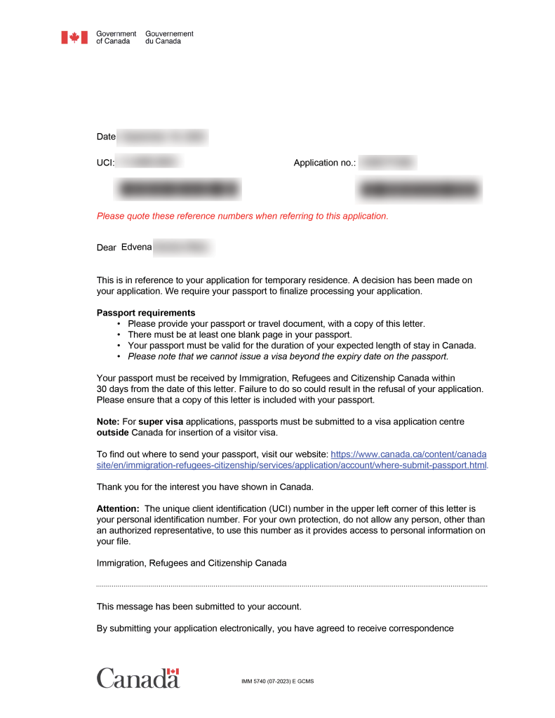 Below, I will list three cases that were approved. I will show the approval letter from the Canadian embassy (IRCC), and some of the files submitted for the applicant, such as the cover letter. Some information was blurred to protect the identity of the applicant.